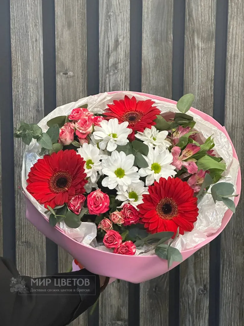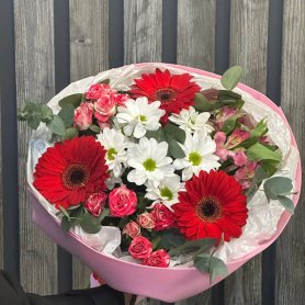 Сборный букет состоит из ярко-красных гербер, белых ромашек и розовых роз, создавая яркий контраст цветов. Зеленые листья добавляют свежести и дополняют общую композицию. Это прекрасный подарок для любого торжественного случая или просто, чтобы порадовать близкого человека.
