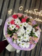 Этот красивый букет с хризантемами станет ярким украшением любого интерьера или отличным подарком для близких. В его составе собраны свежие и яркие цветы: маттиола, диантус, альстромерия, кустовая роза и кустовая хризантема. Каждый цветок тщательно отобран, чтобы создать гармоничный и насыщенный сочетающийся по цвету букет. Он отлично подойдет для поздравлений, праздников или просто чтобы порадовать любимых. Букет обладает долгим сроком свежести и привлекательным видом. Его изящная композиция подчеркнет индивидуальность и вкус дарителя. Закажите этот букет в нашем интернет-магазине и наслаждайтесь красотой и ароматом каждого цветка.