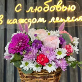 Букет-композиция «Мелодия цвета» в стильной корзине станет ярким украшением любого интерьера или замечательным подарком. В составе — изящные цветы: матиола, роза, фисташка, хризантема кустовая, роза кустовая и гербера, создающие гармоничную палитру. Каждый элемент тщательно подобран для передачи красоты и свежести. Эта композиция подарит радость и добавит уюта в любой дом.